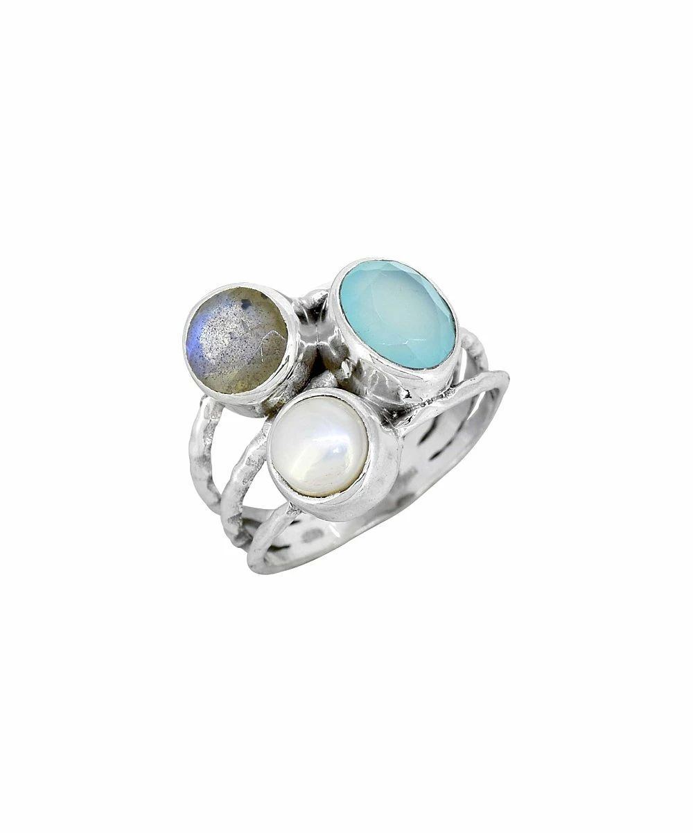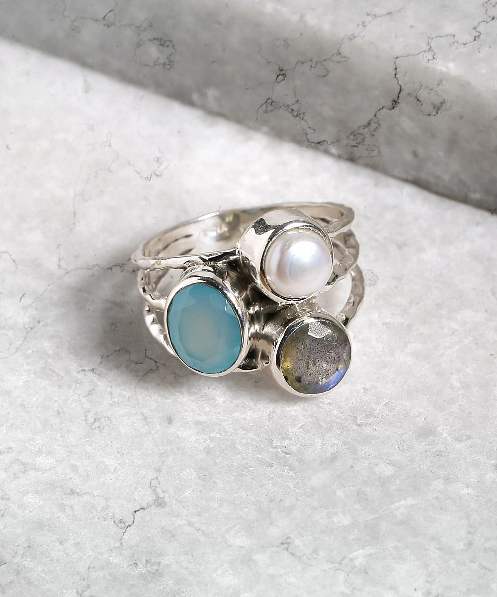 Add to your quirky accessory collection with this sterling silver ring featuring gorgeous chalcedony and imitation pearl accents.