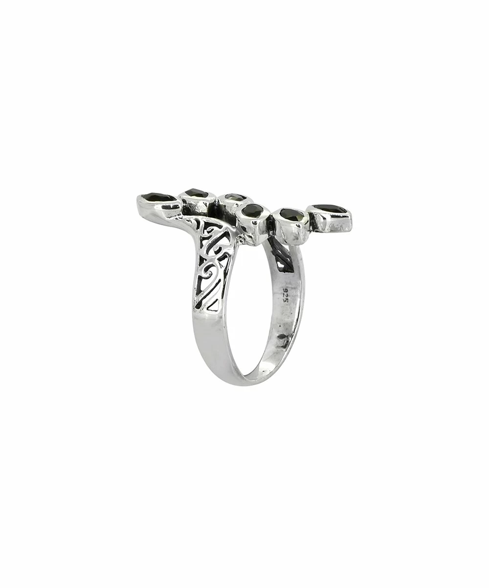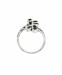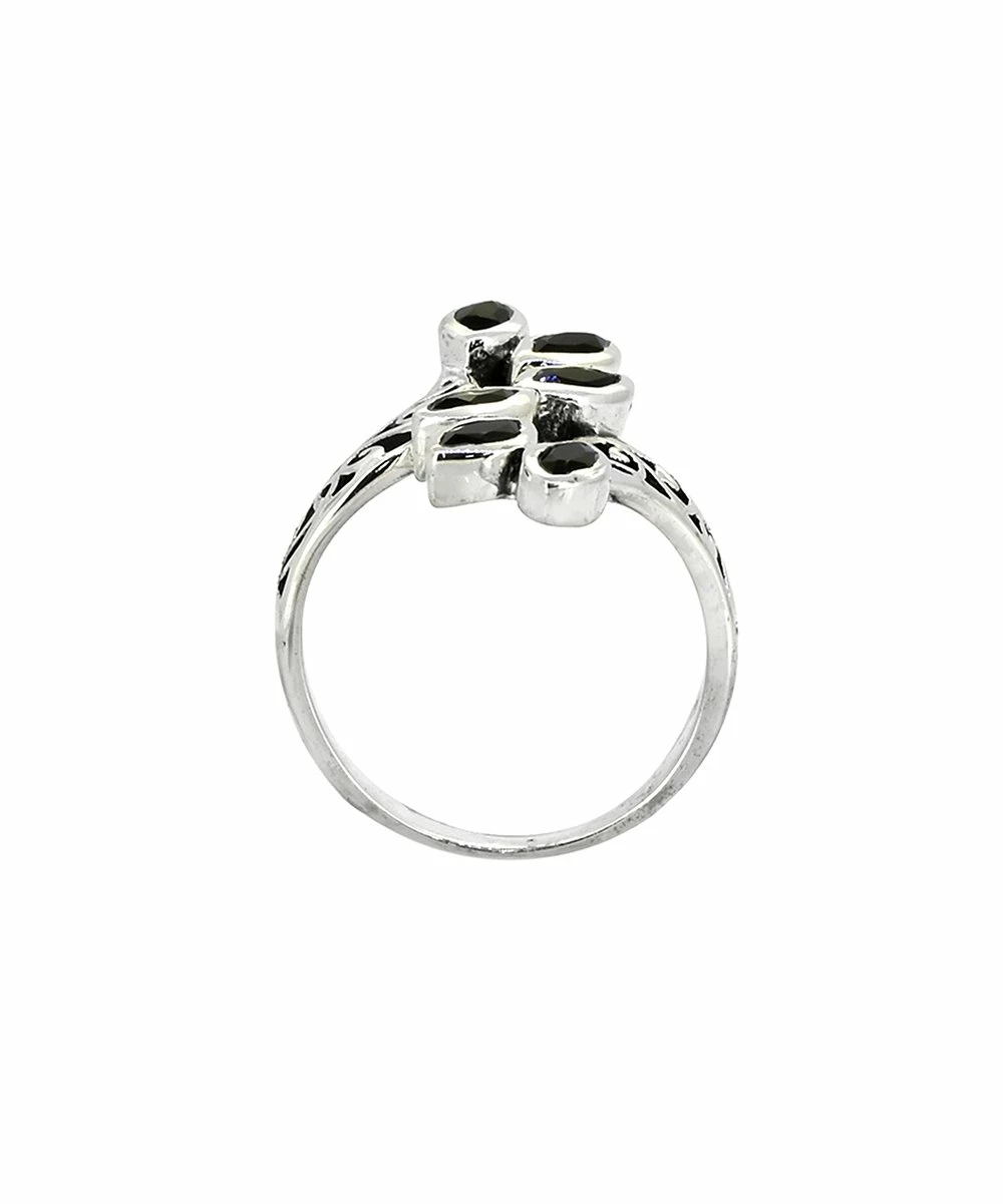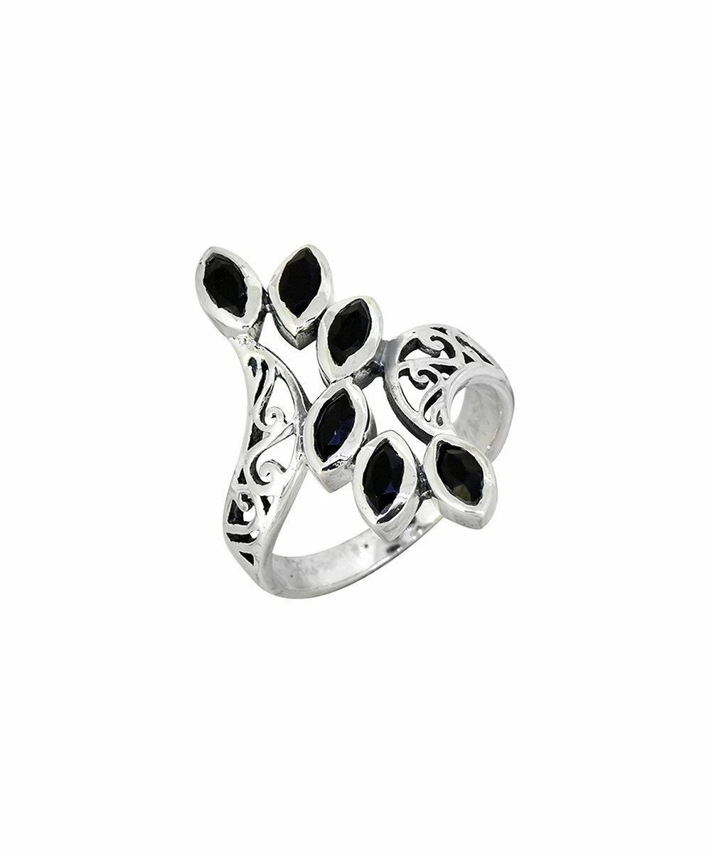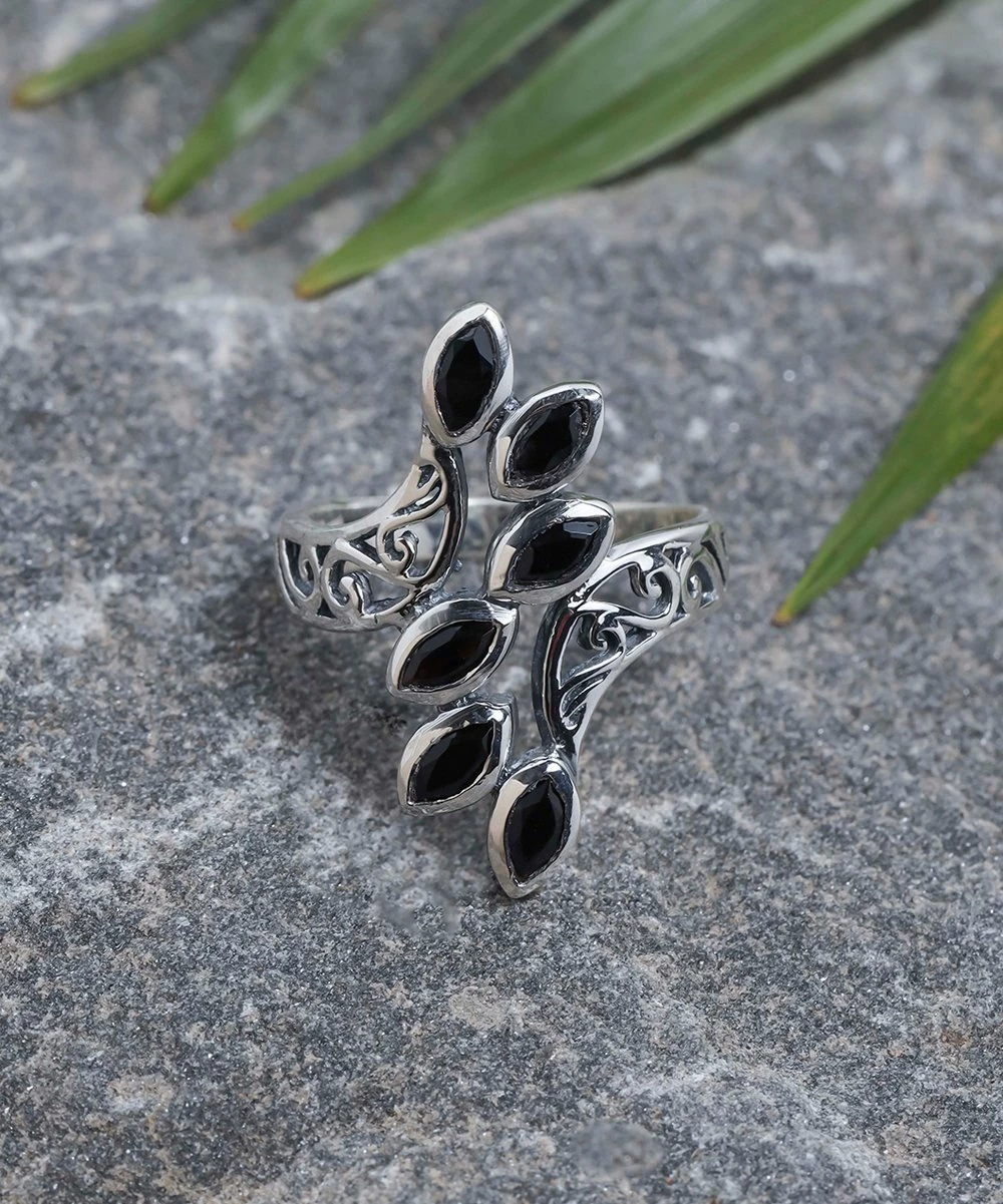 This ring features a leafy texture crafted from sterling silver. Embellished with elegant black onyx accents.
