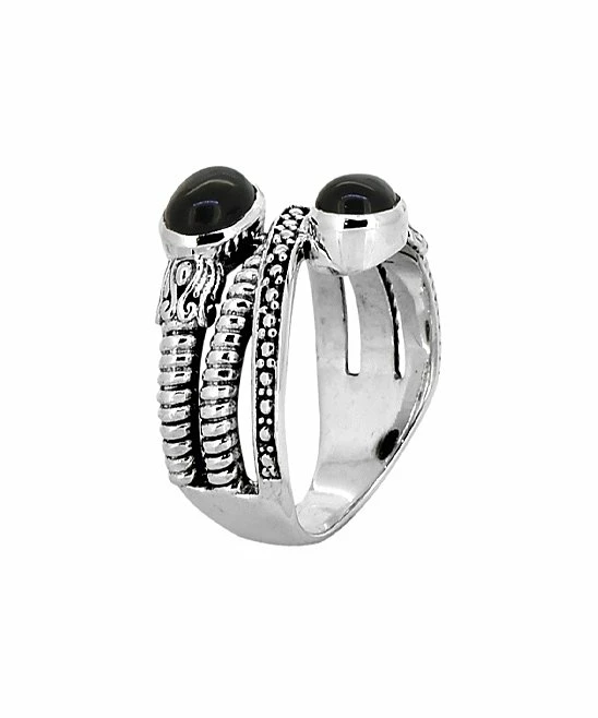 Decorate your digits with this stunning sterling silver ring boasting bold black onyx surrounded by an intricate design.