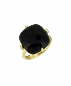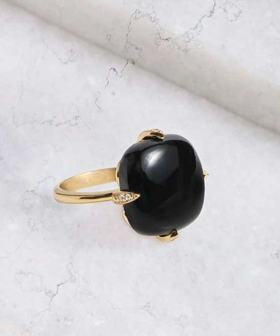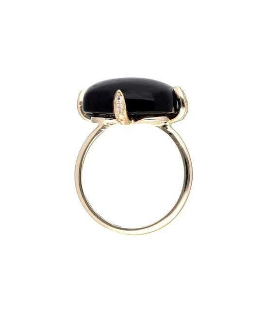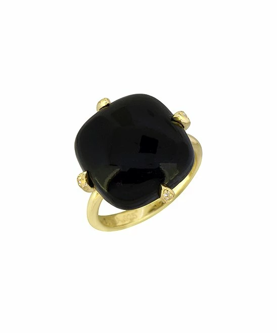 Luxe ring featuring a cushion-cut black onyx face accented by white topaz accents on a prong setting. Crafted with 14-karat gold-plated sterling silver.