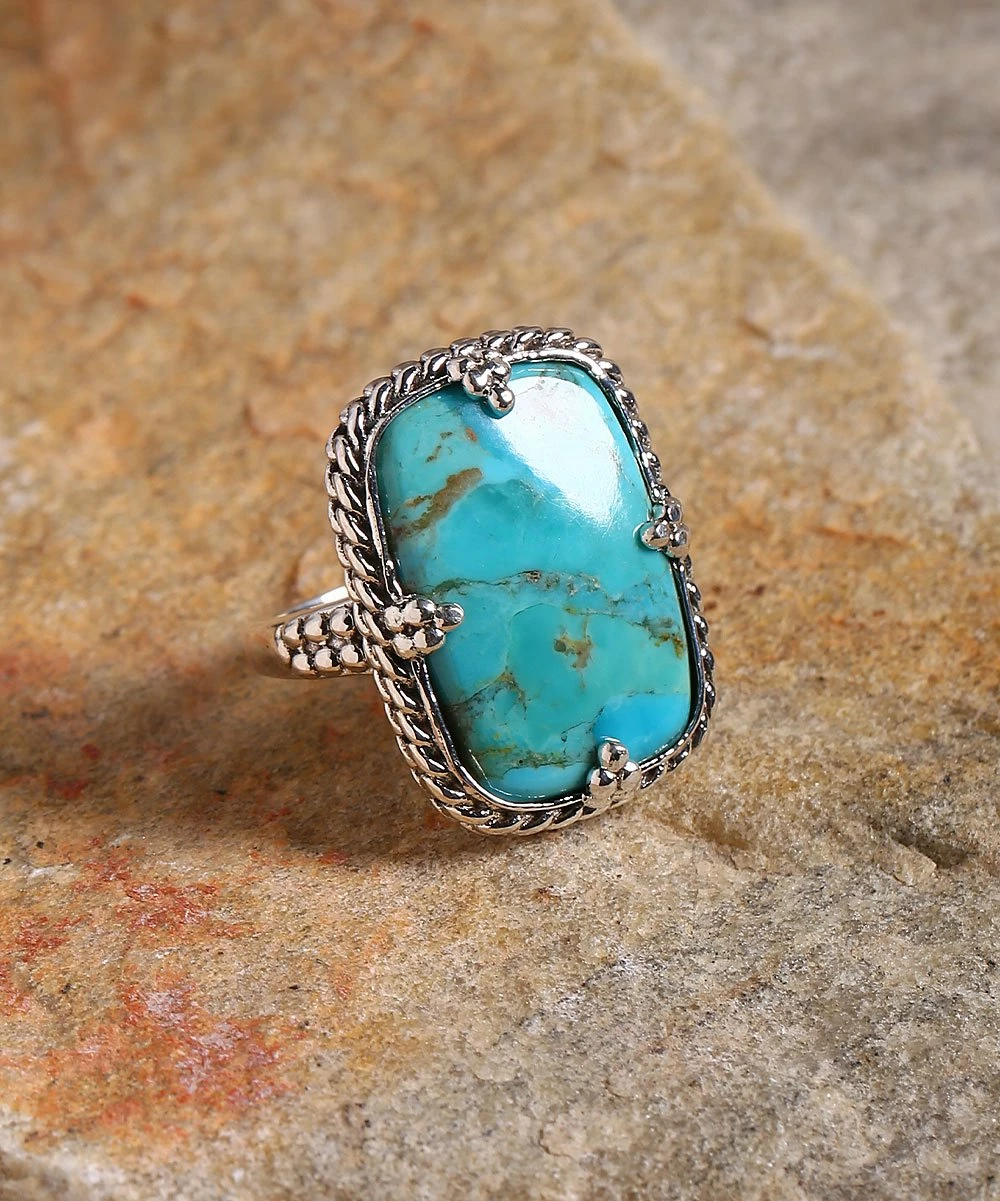 Energize your accessory collection with this unique ring showcasing a bold Mohave turquoise stone surrounded by oxidized sterling silver.
