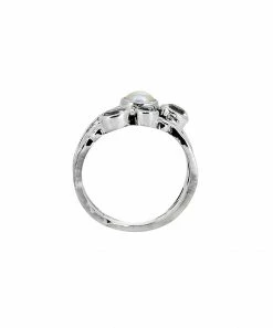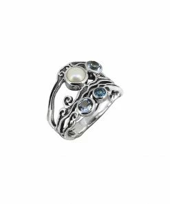 Openwork sterling silver ring accented by round-cut blue topaz and cultured pearl accents.