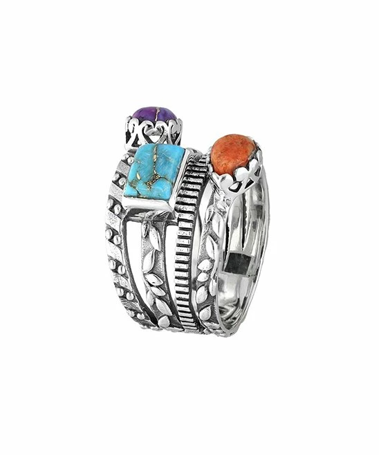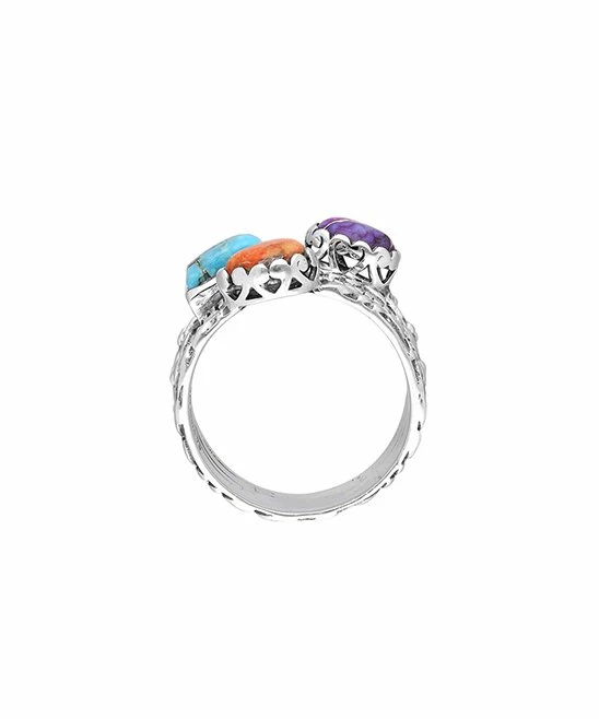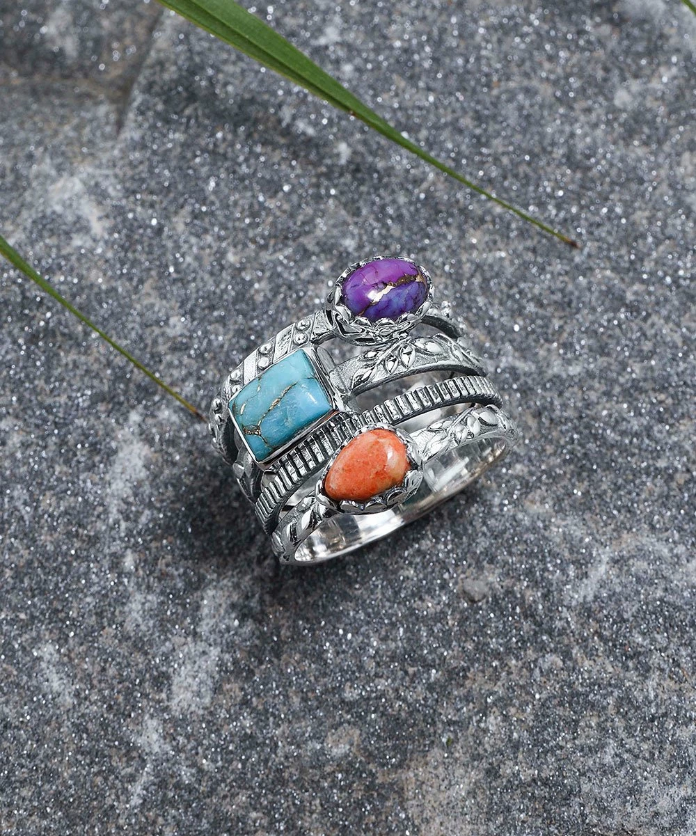 Three types of turquoise add earthy impact to this sterling silver ring touched with delicate leaf detailing.