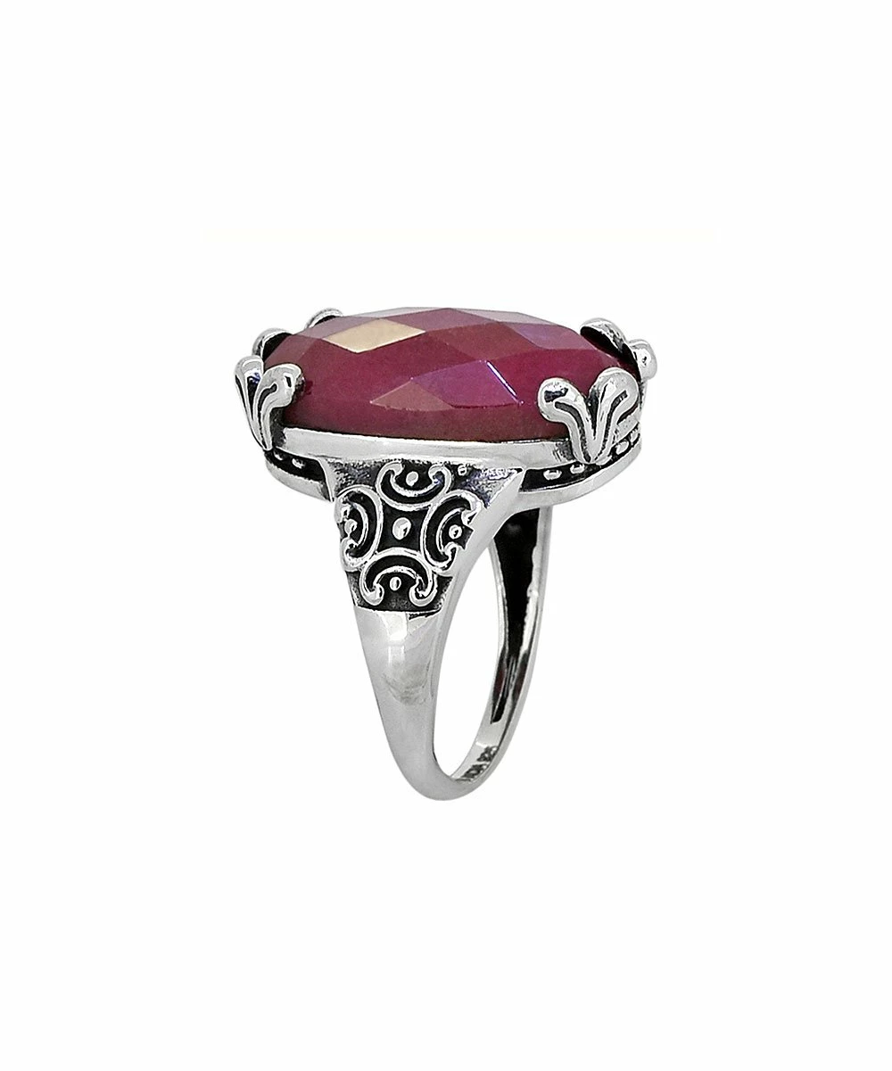 Add artistic flair to your collection of jewelry with this stand-out sterling silver ring crafted with a faceted ruby center and filigree band.
