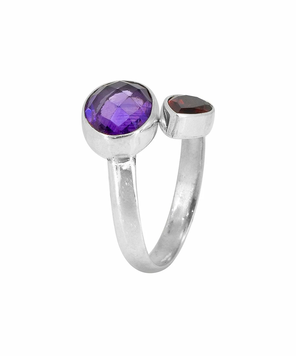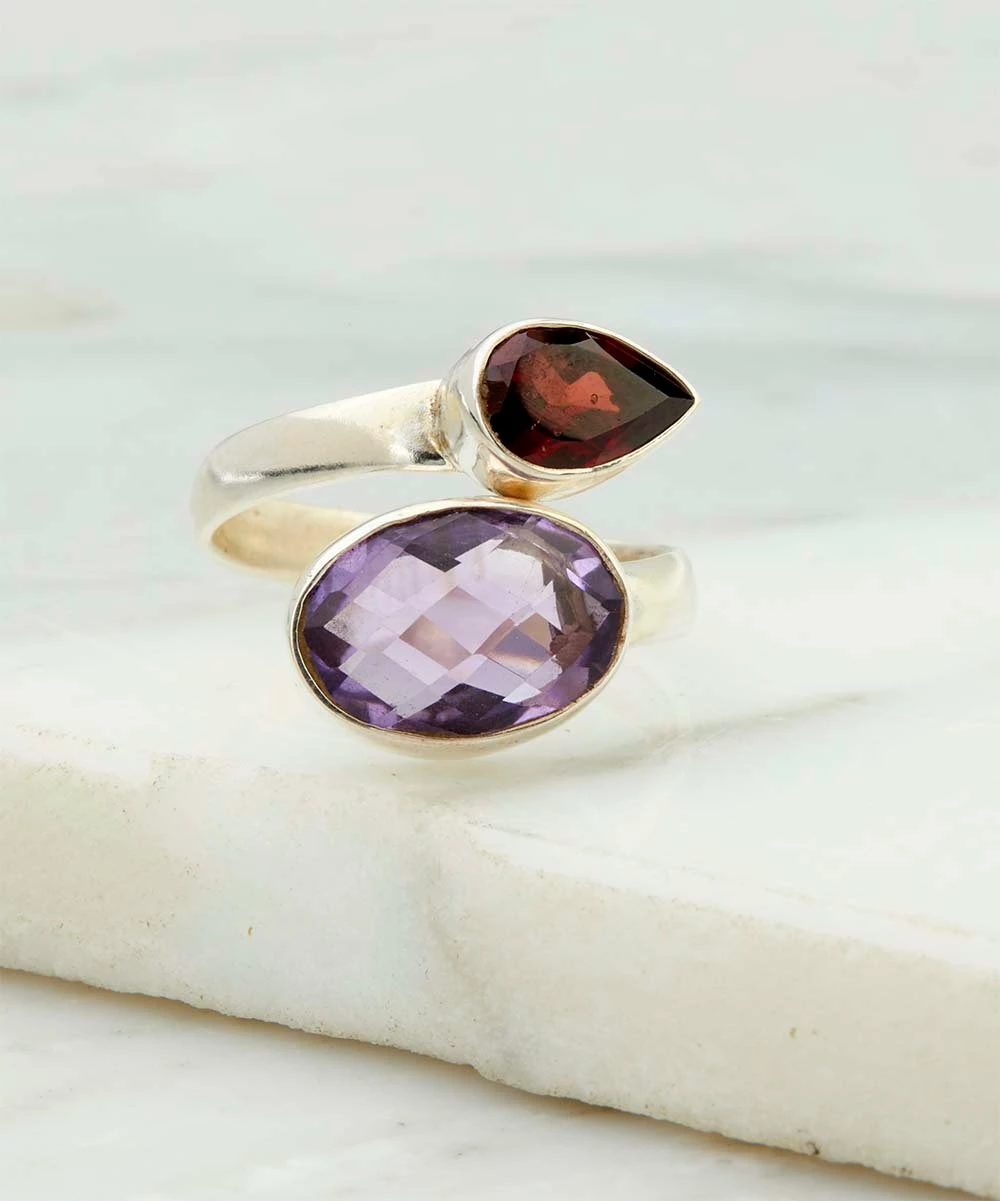 You radiate with timeless dazzle when you wear this ring that features a bypass design and is adorned with garnet and amethyst.