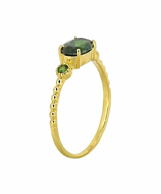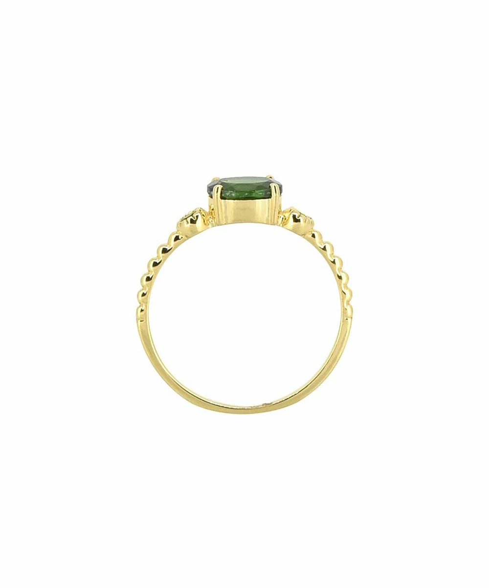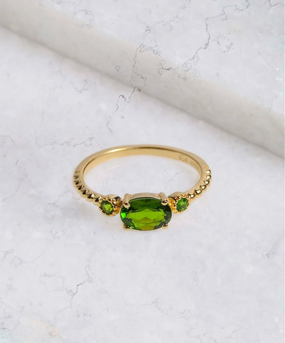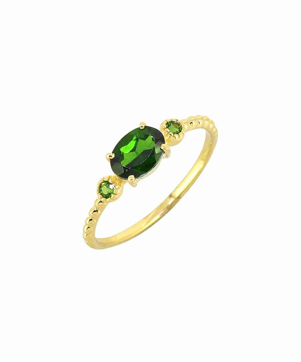 This ring has 14k gold-plated texturing, chrome diopside details and pronged diopside for an elegant accent.