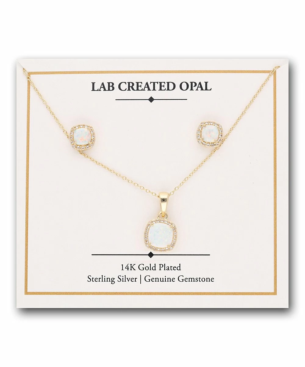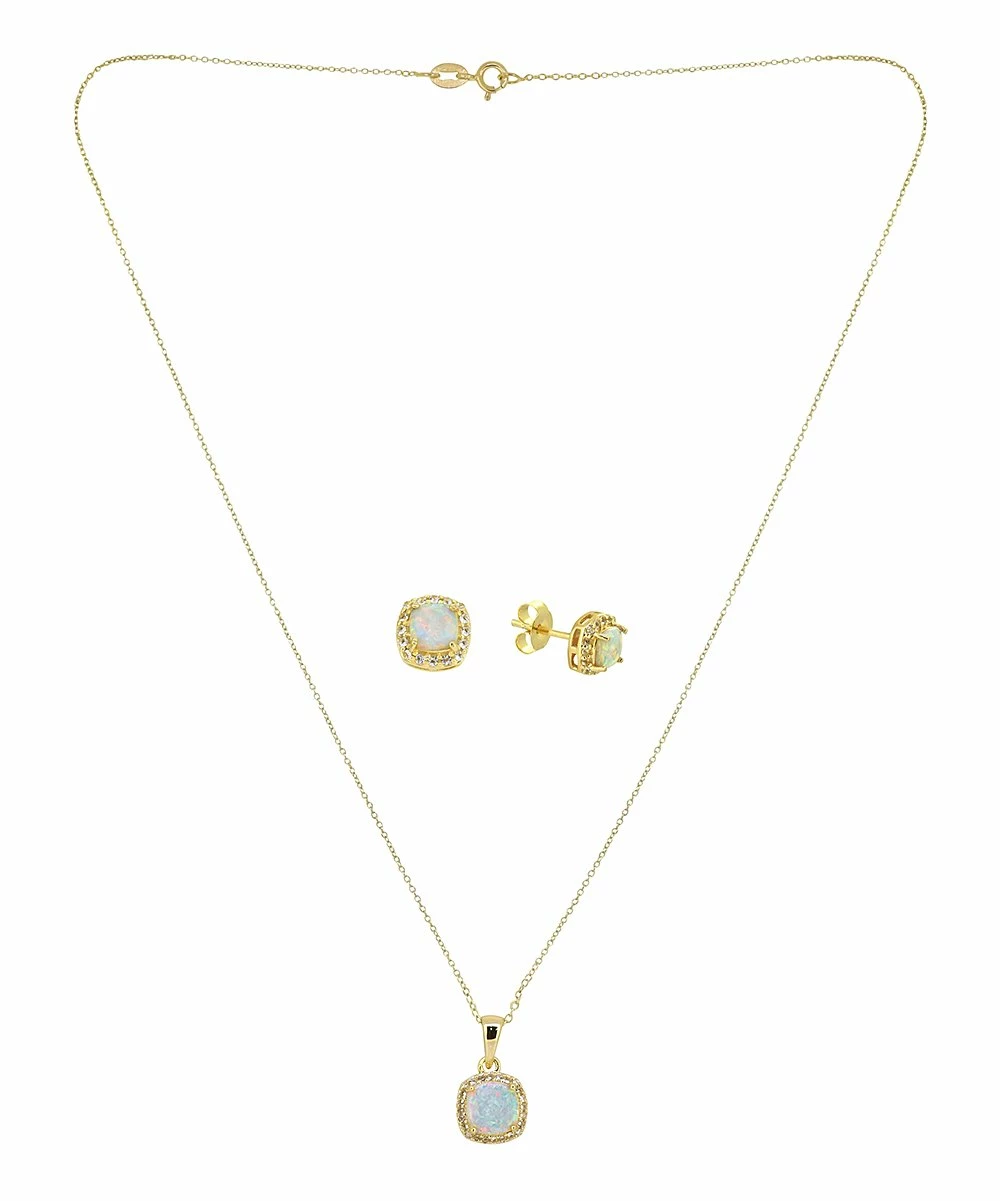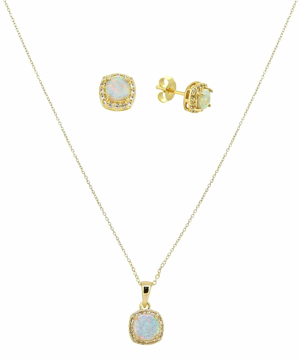 Elevate your ensemble with this matching pendant necklace and earrings set featuring cushion-cut opals with white topaz accents and a delicate 14-karat gold-plated chain.