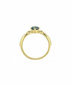 Exquisite 14k gold-plated ring highlighted with an exquisite prong-set London blue topaz stone, flanked at either side by white topaz accents.