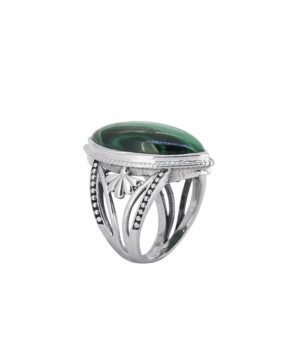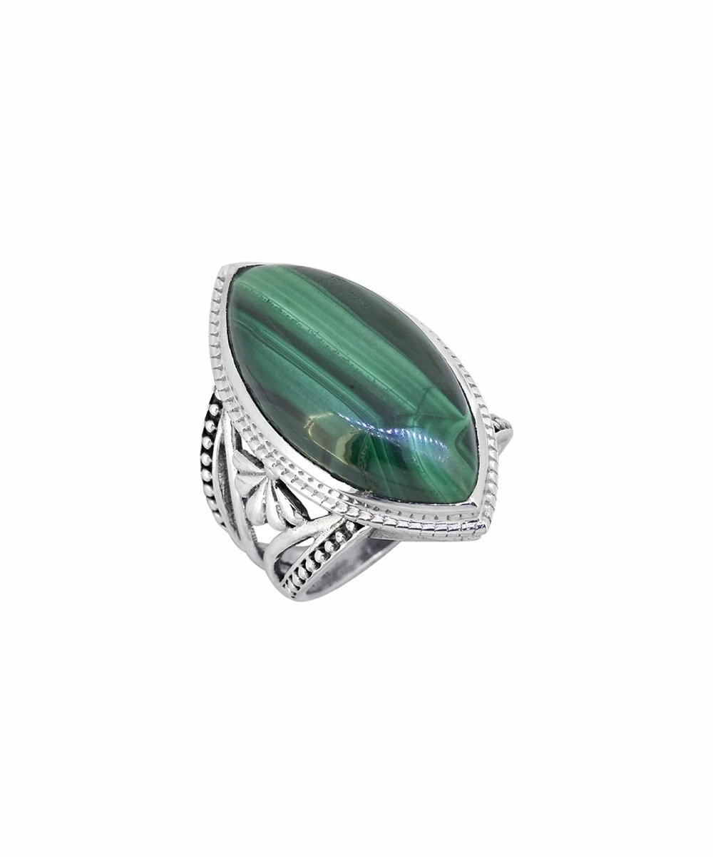 Step up your everyday style when you don this sterling silver ring featuring unique openwork details and a marquise-cut malachite centerpiece for an enchantingly-sweet look.