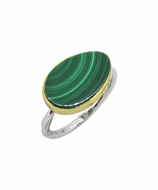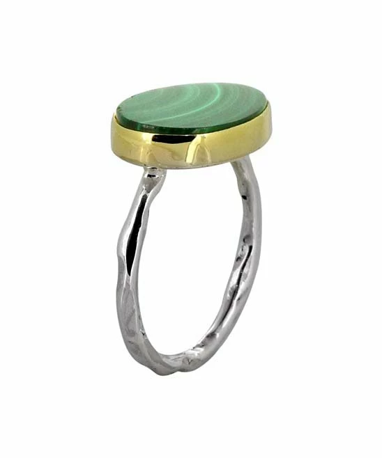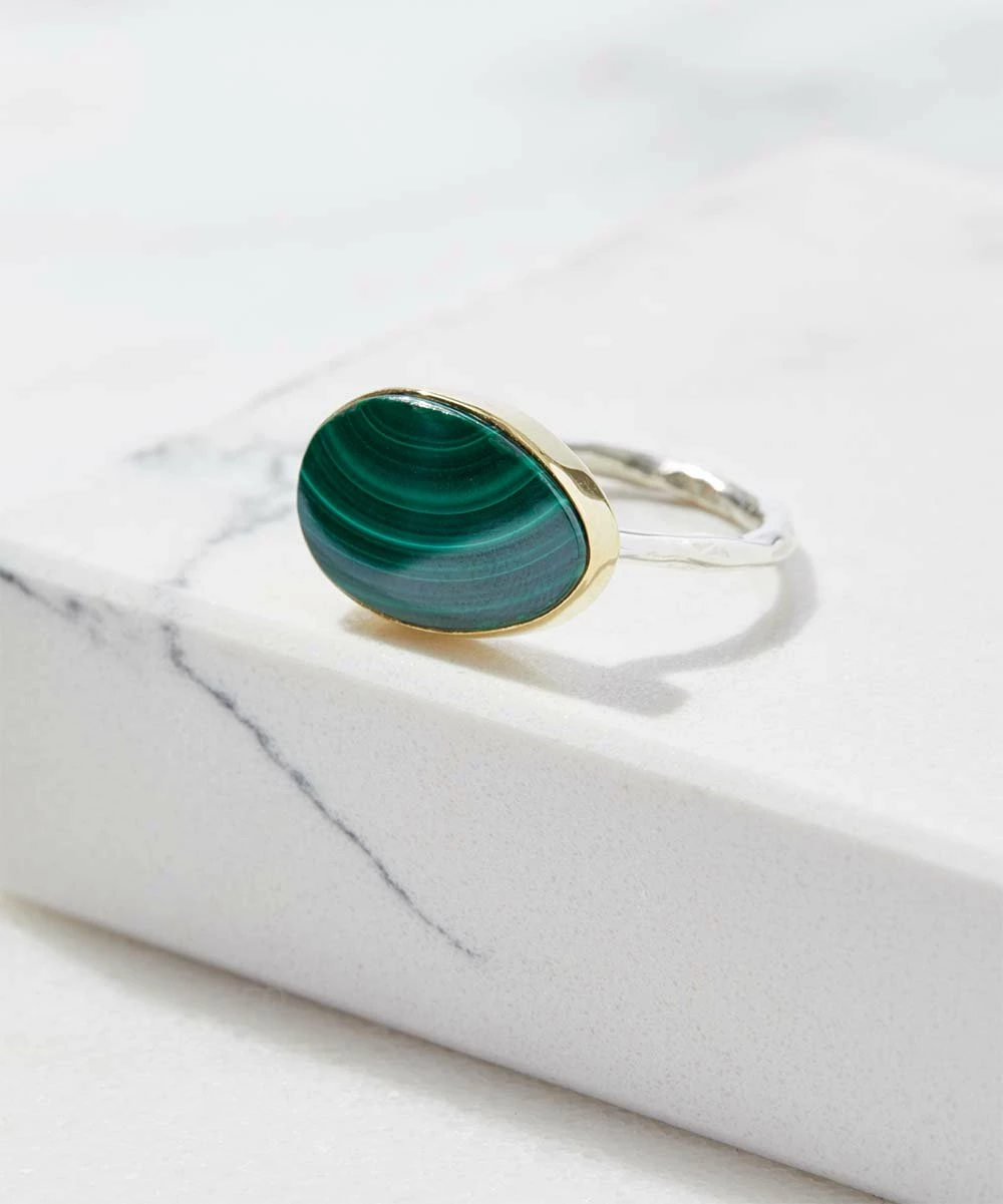 Brighten your jewelry collection and add a colorful bohemian vibe to outfits with this malachite ring, featuring elegant brass detailing and a hammered sterling silver band.