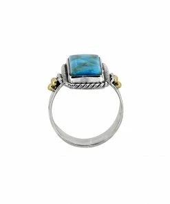 A Mohave turquoise stone sits at the center of a sterling silver frame with a rope-textured trim.