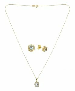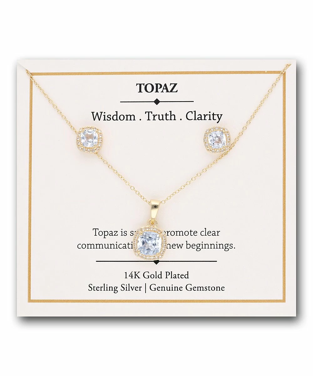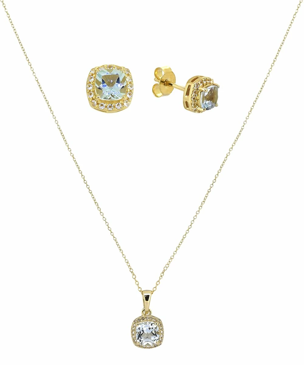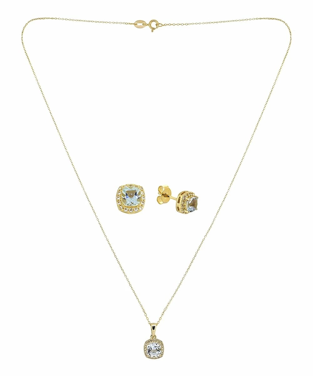 Accent your ensemble with this matching pendant necklace and earrings set featuring cushion-cut blue topaz and a delicate 14-karat gold-plated chain.