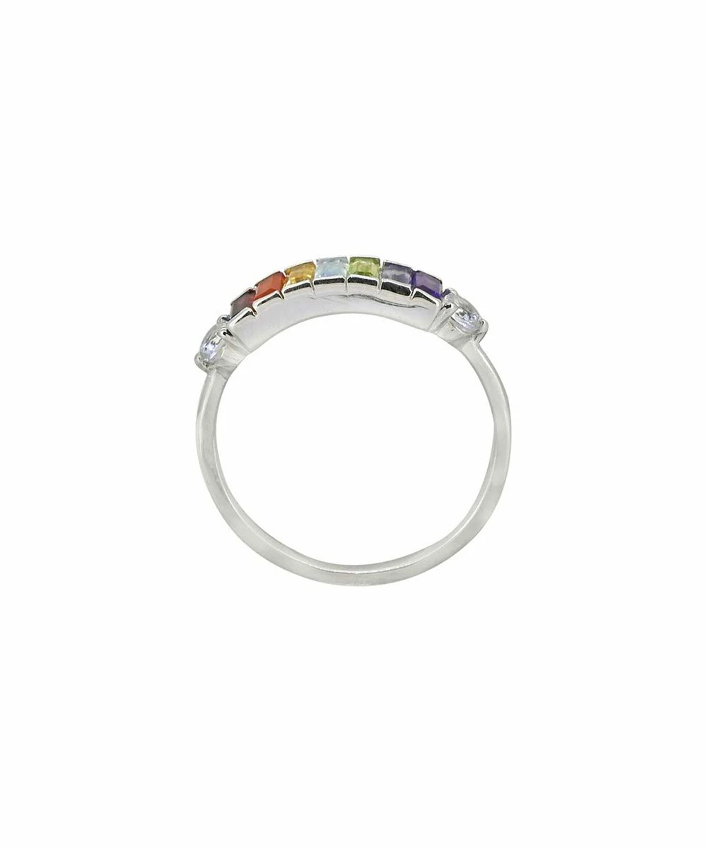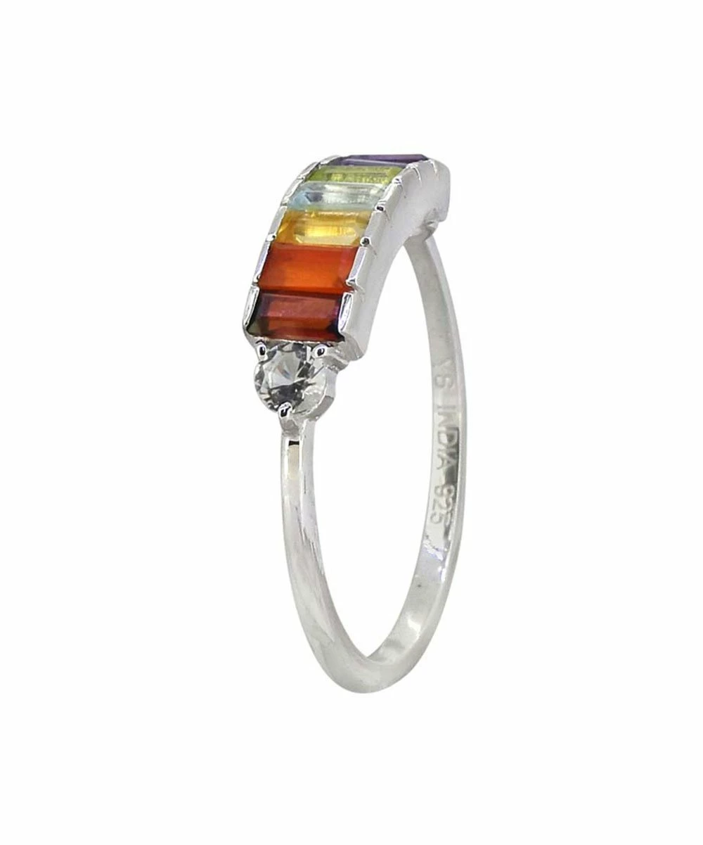 Accent your ensemble with this gleaming sterling silver ring featuring a rainbow of emerald-cut stones.