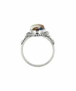 Elegant and earthy, this sterling silver ring features a vibrant oyster Mohave turquoise oval framed with layers of dainty milgrain trim.