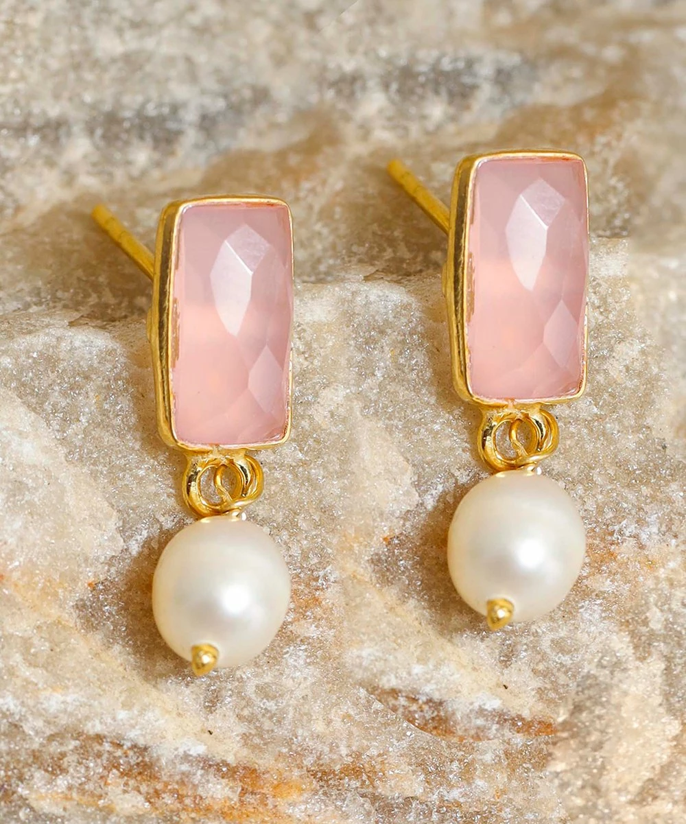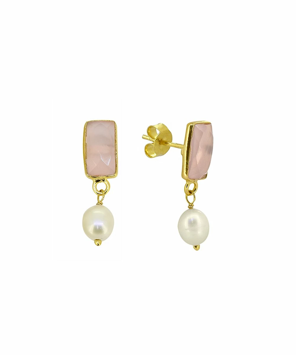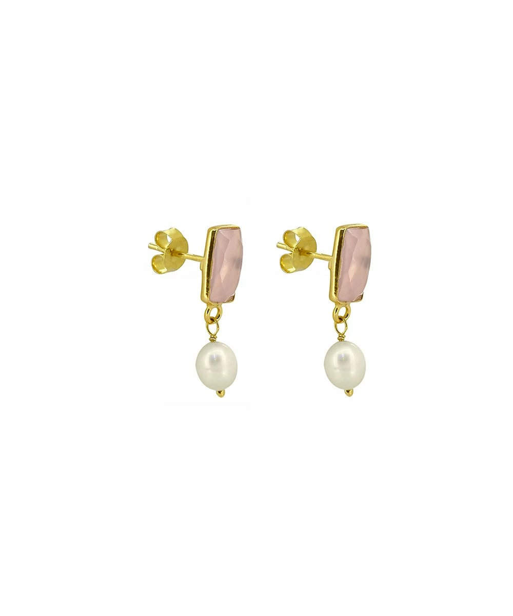 Drop earrings with pink chalcedony and cultured pearl. 14k gold-plated sterling silver.