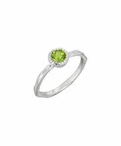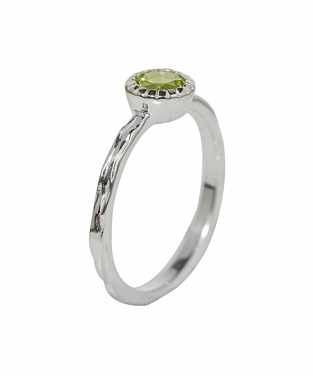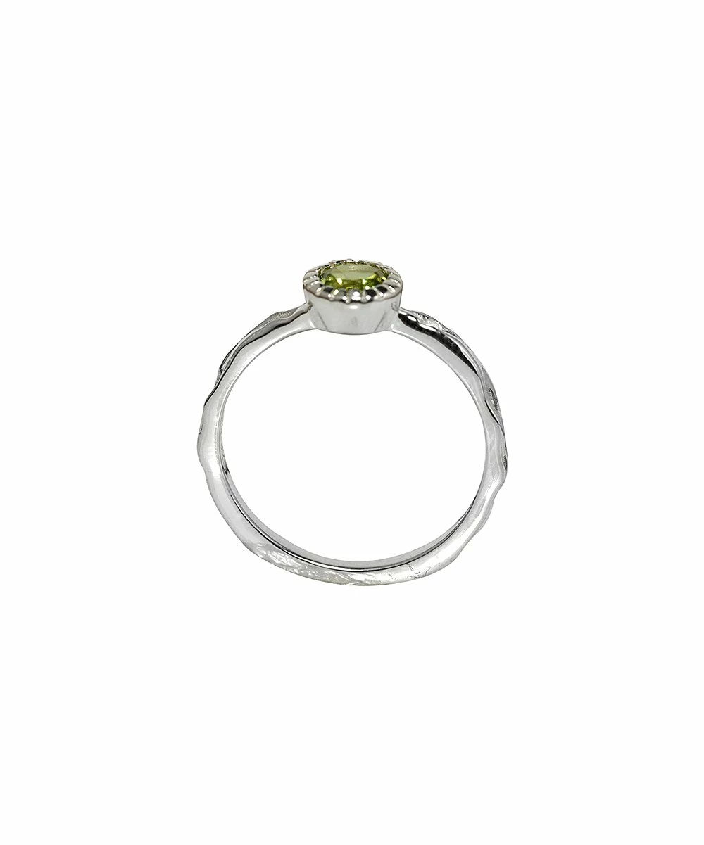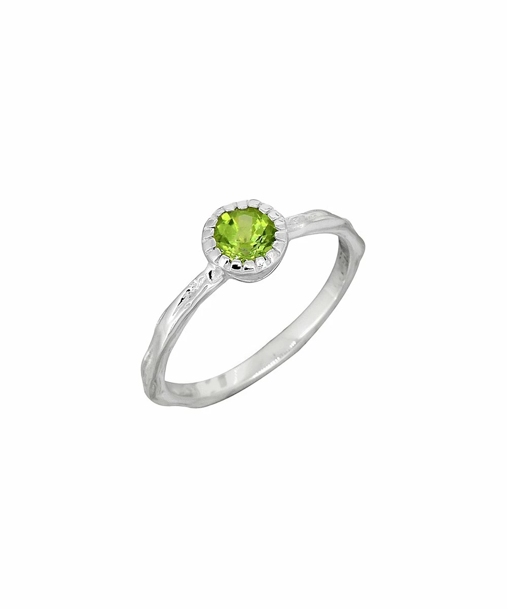 A round-cut bezeled peridot takes center stage on this sterling silver ring.