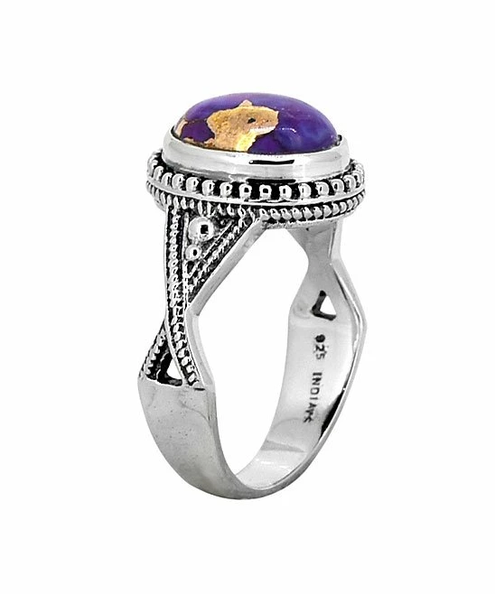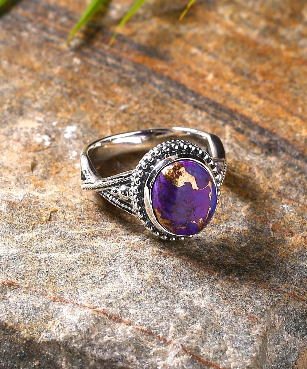 Enhance your touch with this ornate ring featuring polished sterling silver and a purple copper turquoise face for statement-making accessorizing.