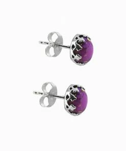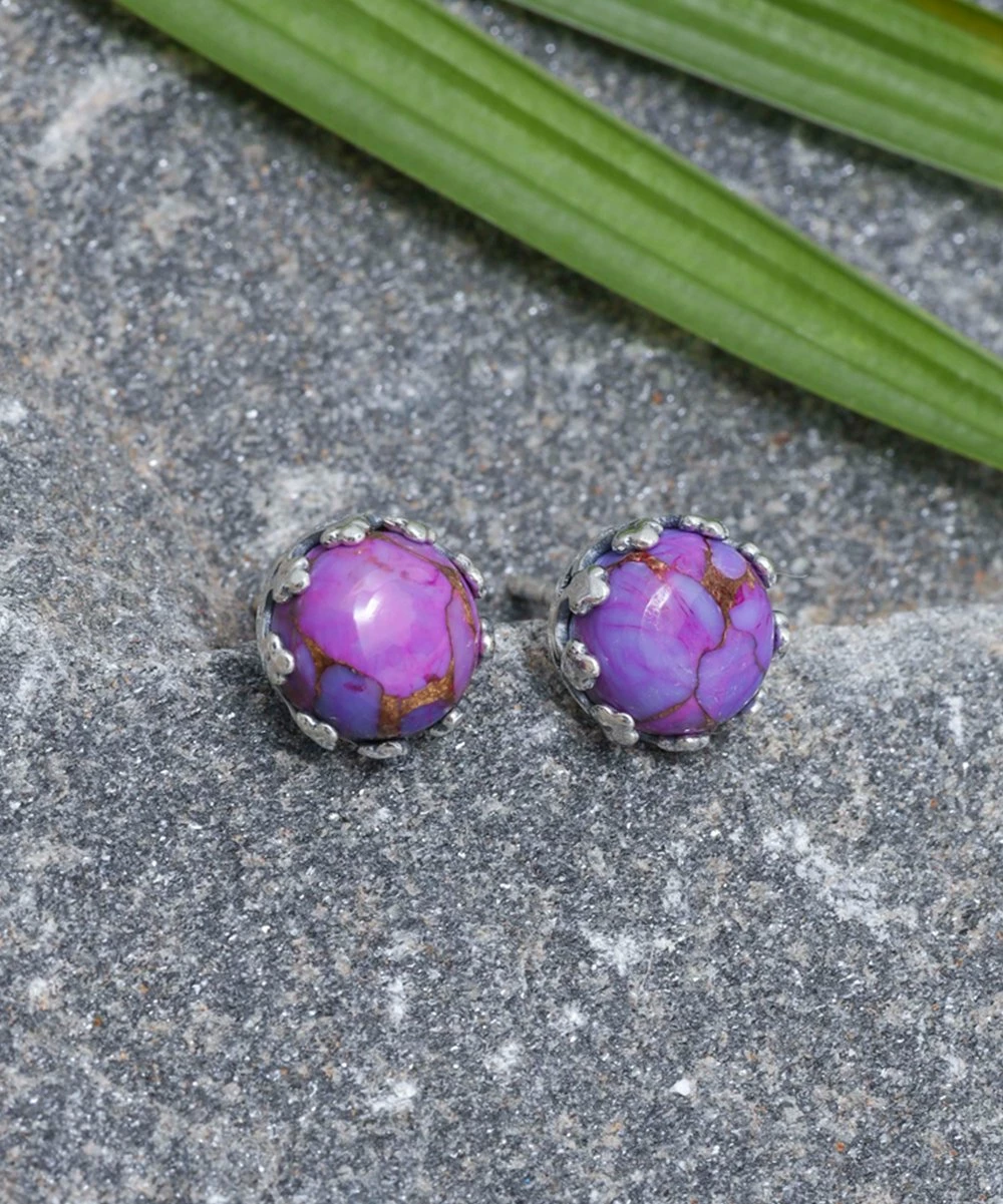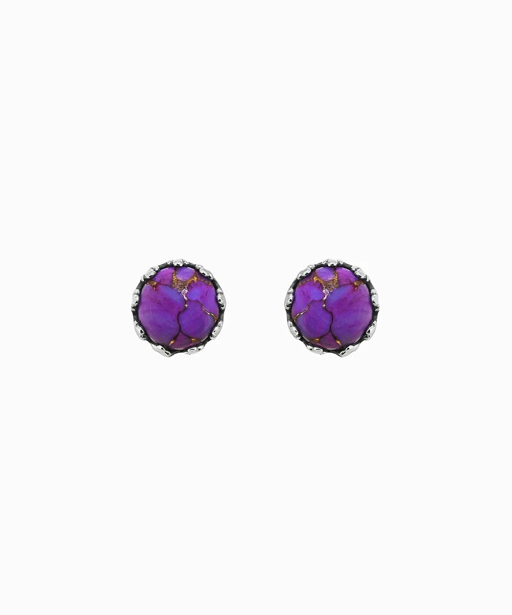 Light-catching purple copper turquoise stud earrings framed with sterling silver metal in a subtle vintage-inspired motif.