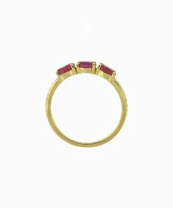 Simulated ruby sets pronged in chic ring. Shiny 14-karat gold-plating with dotted design.