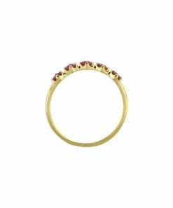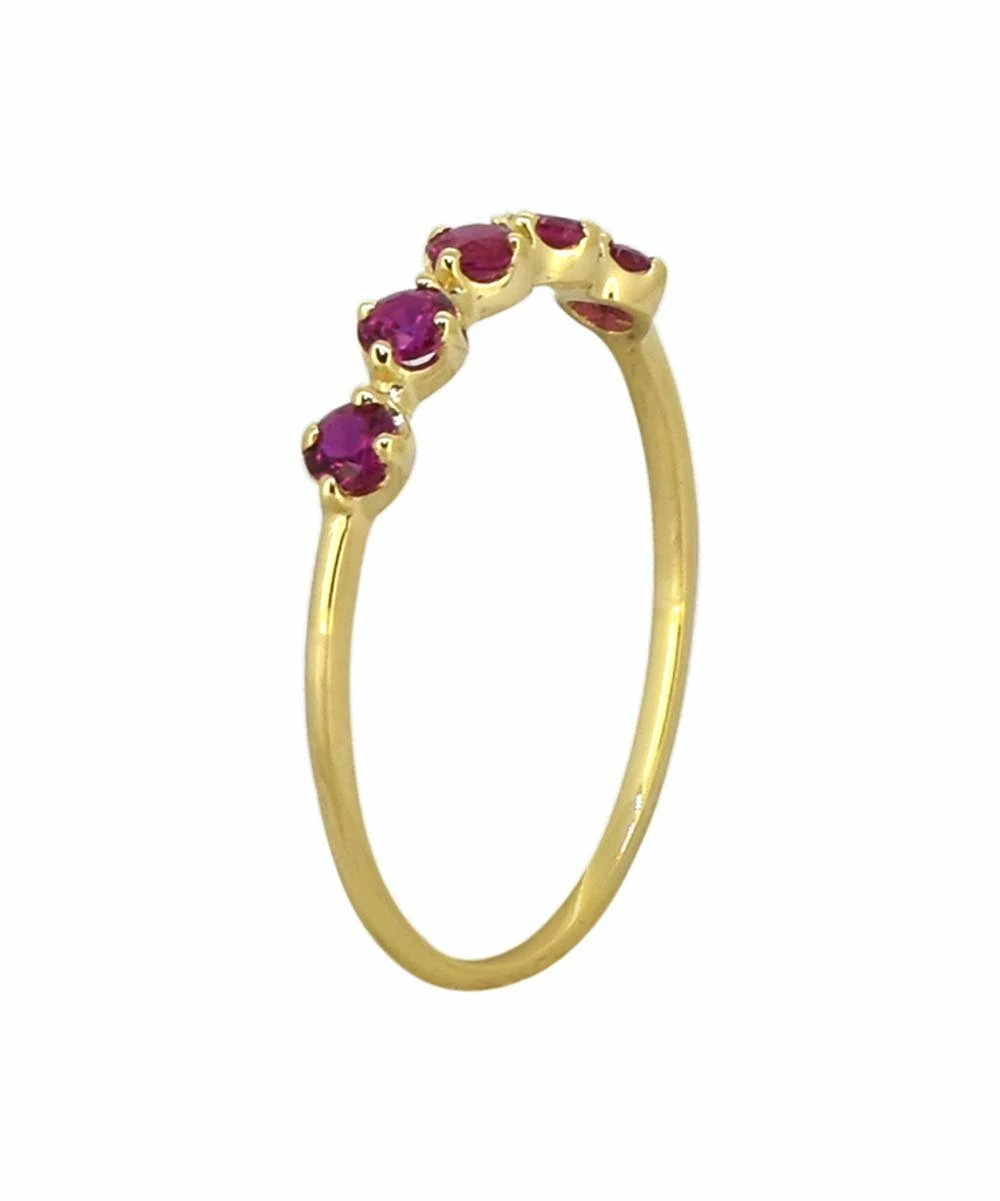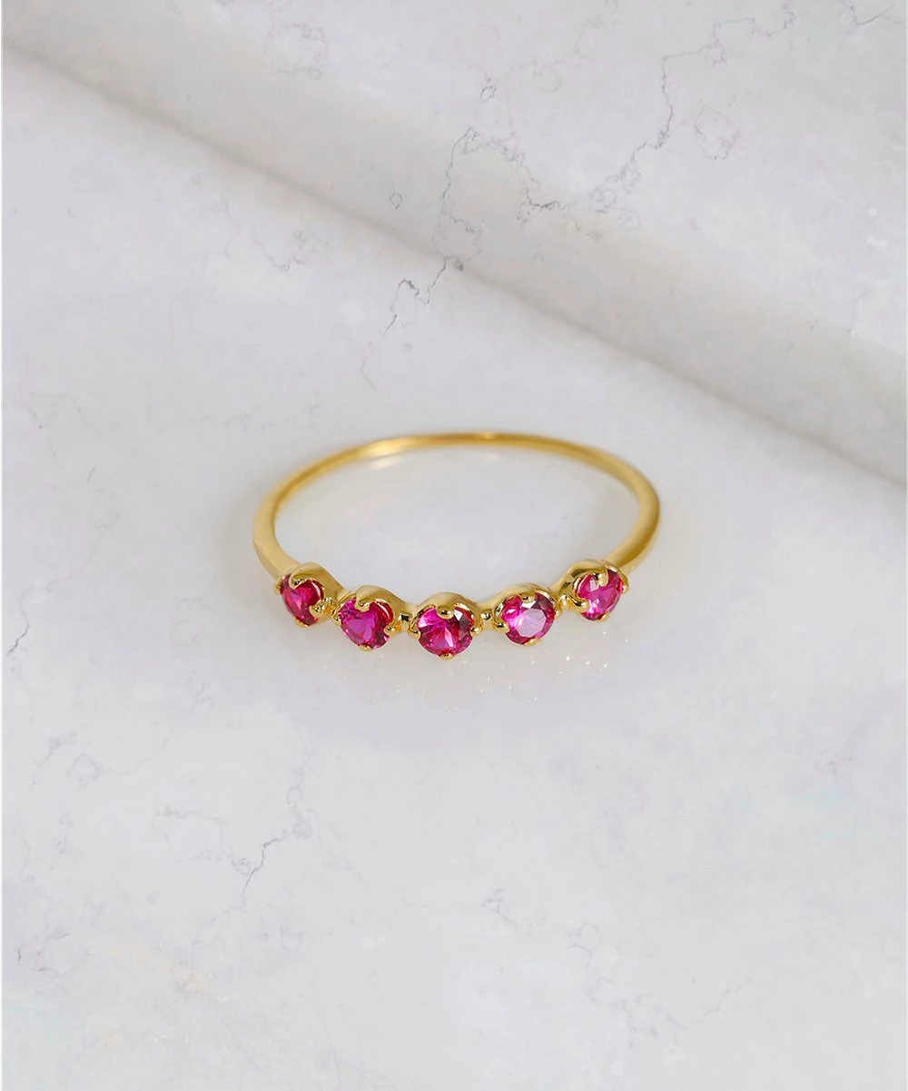 Touched with a quintet of round-cut simulated ruby stones, this 14-karat gold-plated ring adds sparkling vibrance to your look.