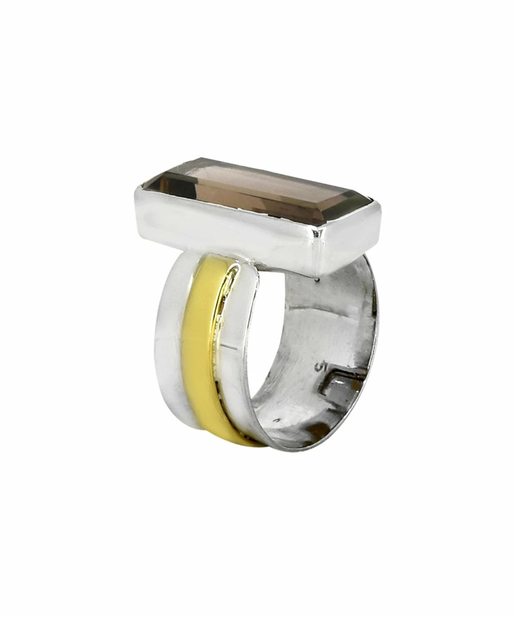 Boost your daily accessories collection with an eye-catching ring that features a sterling silver and brass contrast with a coordinating emerald-cut smoky quartz.
